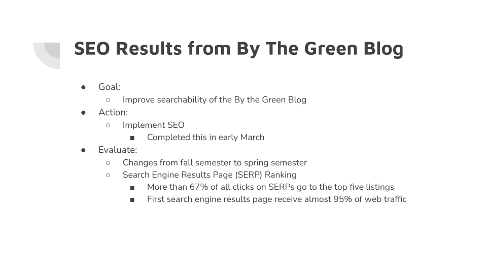 This senior project focused on analyzing some of our social media channels and marketing communications with students (e.g. Student Life Newsletter) to see if there were ways to utilize analytics to drive growth and/or engagement with students on these different channels. Ways that this was done was by implementing A/B Subject Line testing on the Student Life Newsletter to increase open rates and click through rates (CTR), implementing Search Engine Optimization (SEO) on our By the Green blog, and more. After analyzing the data and results, the final recommendations given were: 1) to create more student-focused series to post on Instagram, as that is the content that performs best on Instagram and gets the most engagement from students, and 2) to continue doing A/B for the Student Life newsletter to increase open rates and CTR and ensure that the content is what students want to see.